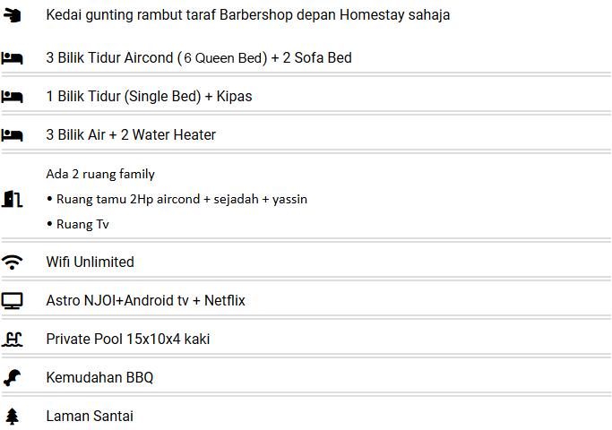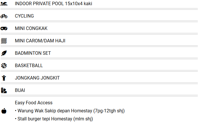Homestay sebuah Rumah Banglo setingkat 1 Corner Lot, lebih privacy dan mempunyai kemudahan private pool yang berkonsepkan indoor, tepi pintu homestay sahaja dan berbumbung, selesa untuk anak anak bermain pool tidak kira waktu panas atau hujan,laman santai untuk aktiviti bbq,wifi percuma, boleh memasak,membasuh,lengkap kemudahan dan ruang parking yang mudah dan lapang.